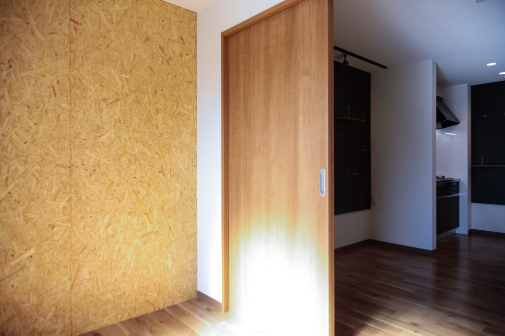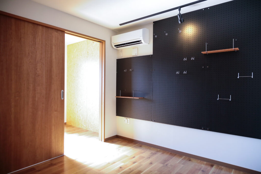 また、こだわりの部屋に平凡なシーリングライトは似合わないのでペンダントライトやスポットライトの設置が出来るライティングレールも準備しました。物件によっては、有孔ボードの他にピンを自由に打てるOSBボードを採用し、無骨な雰囲気に仕上げたものもあります。