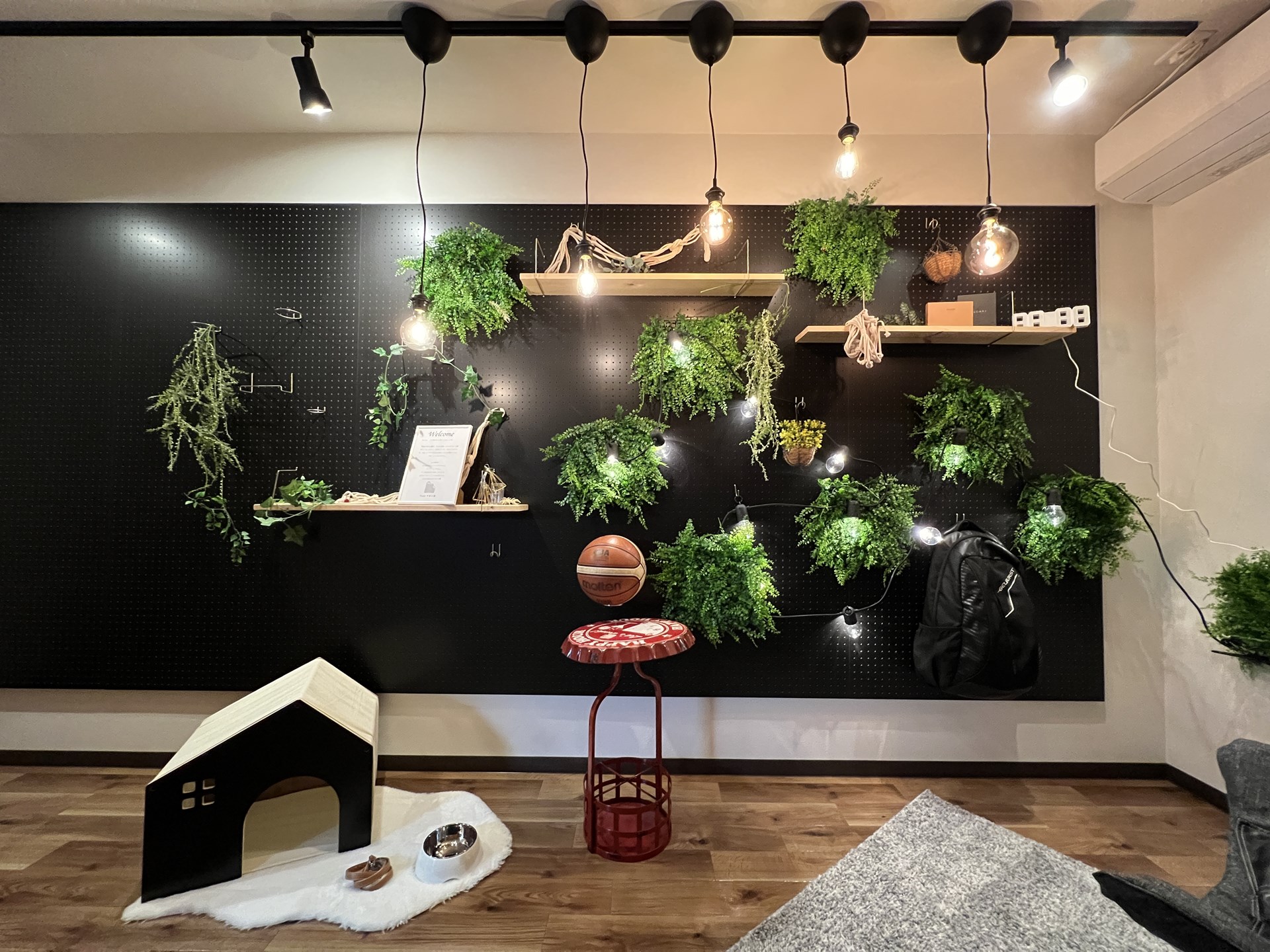カスタマイズプランのリビングの壁は一面が有孔ボードなので取り付けたフックに服やキャップをかければインテリアの一部になります。棚を取り付けて観葉植物や写真を飾ればインテリアショップ顔負けの空間にも。