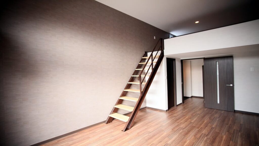 高い天井とストリップ階段が開放感を演出します。専有面積は35㎡ほどですが、約3.7mと高い天井とストリップ階段が開放感を演出し、体感としてはさらに広く感じます。