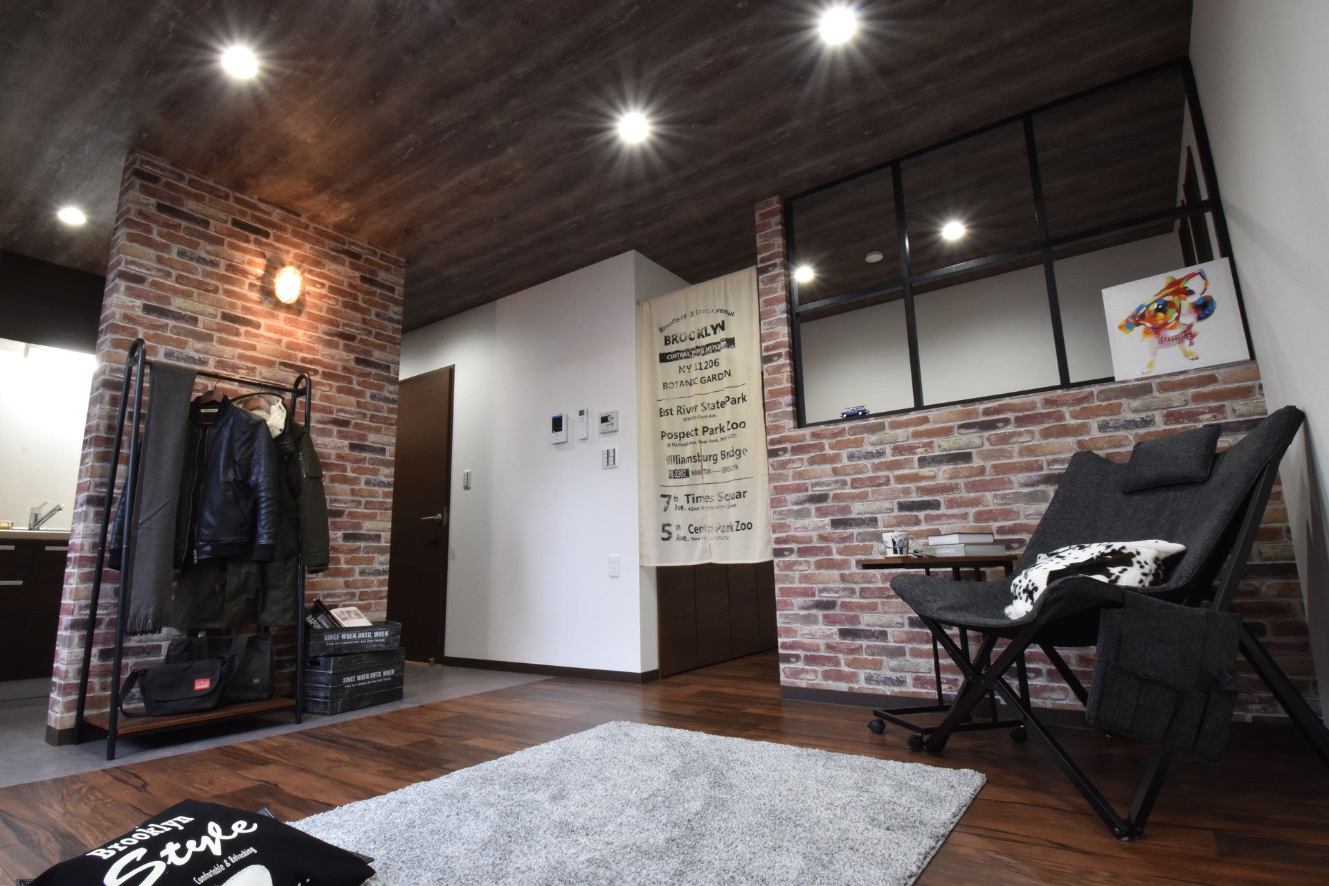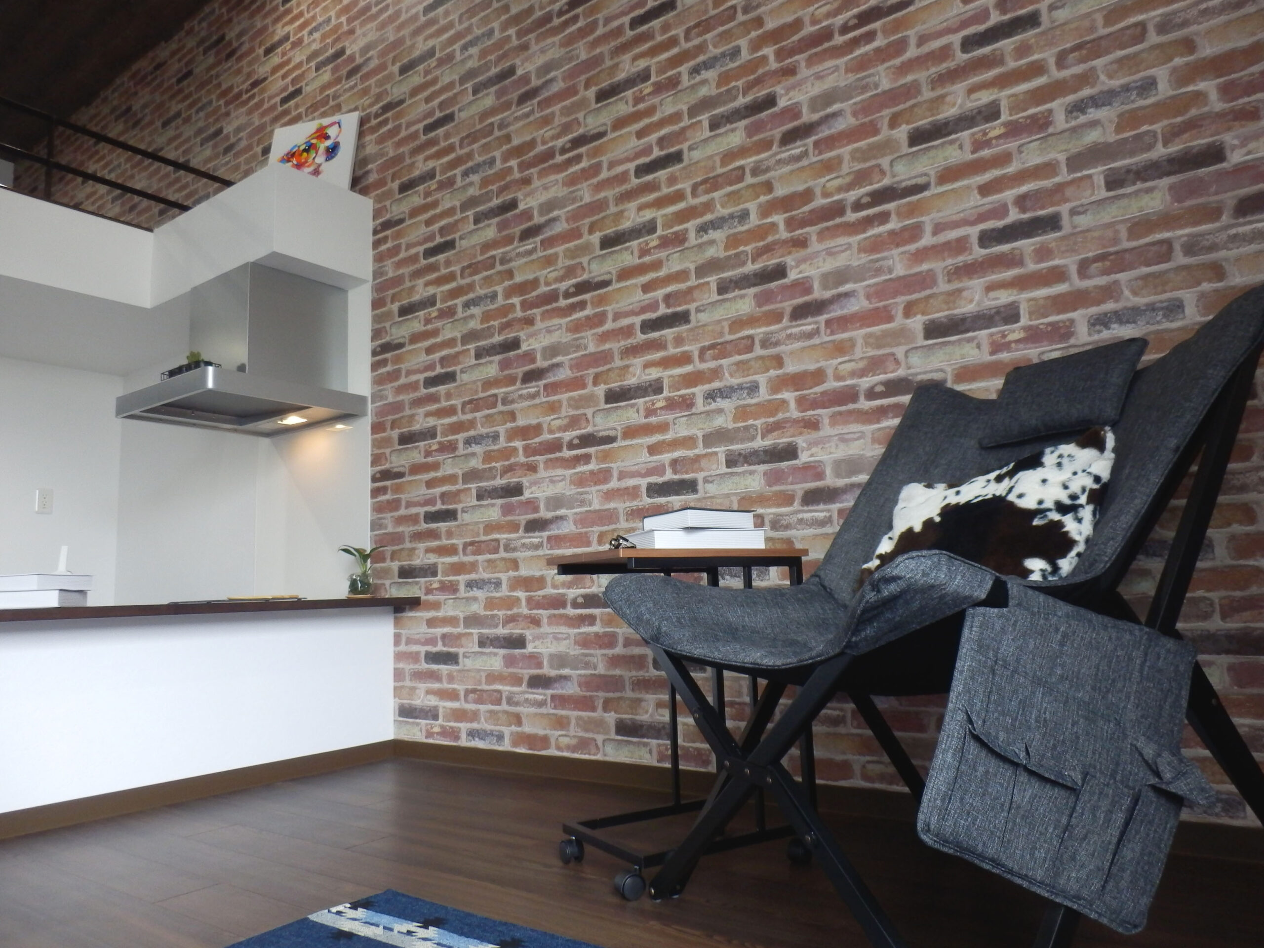 リビングにはレンガ調のクロスを採用。フロアや天井クロスもテイストを合わせているので、主張しすぎずお洒落に決まります。