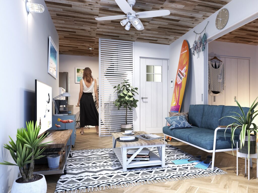 リビングには、海の家を彷彿とさせるアンティークなマリンランプを設置。室内ドアも通常の賃貸物件よりグレードアップしたものを使用しています。