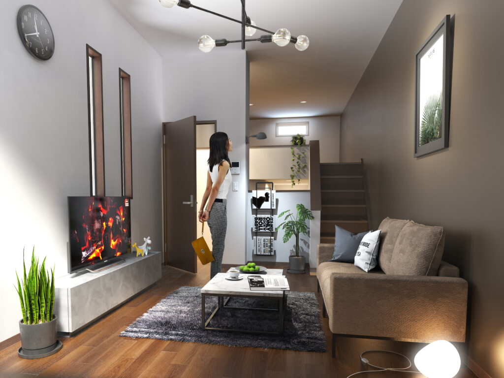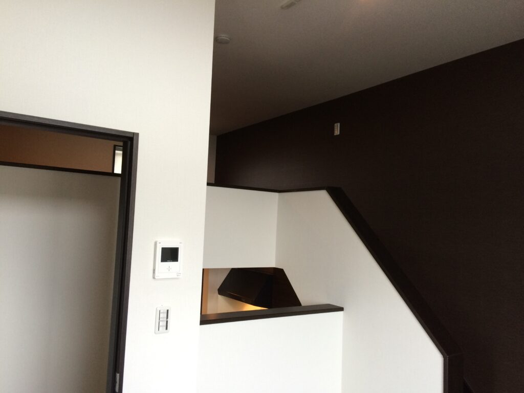 玄関からリビングへの導線にあえて階段を設けることで、玄関から室内が直接見えない工夫をしており、固定階段で上がるロフト付きで実際の部屋面積よりも体感の方が広く感じられます。