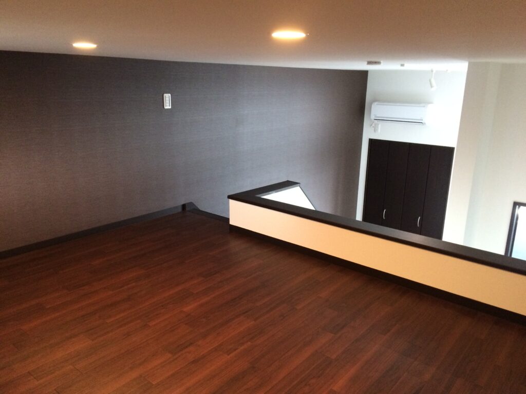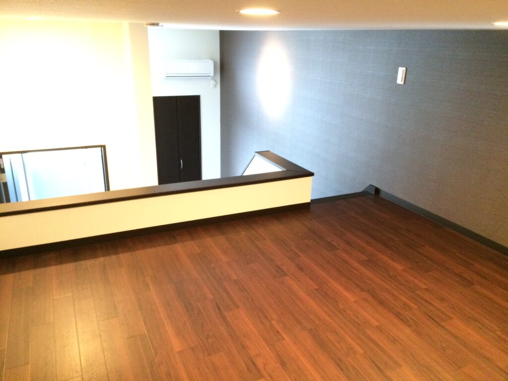 固定階段を上った先には、約10㎡のロフト付き。1つの部屋のようになっているので1Kですが1LDKのような使い方ができると好評です。