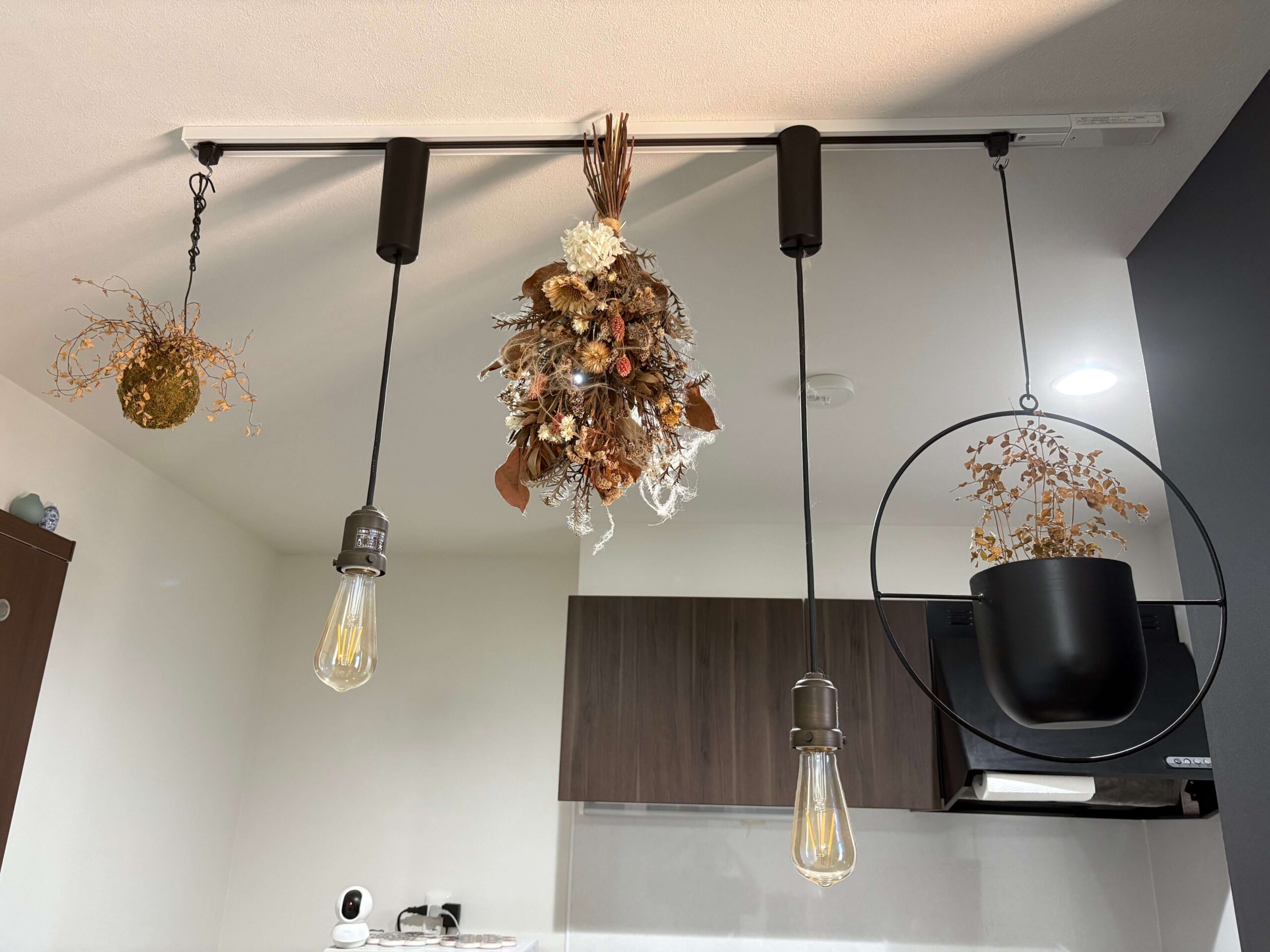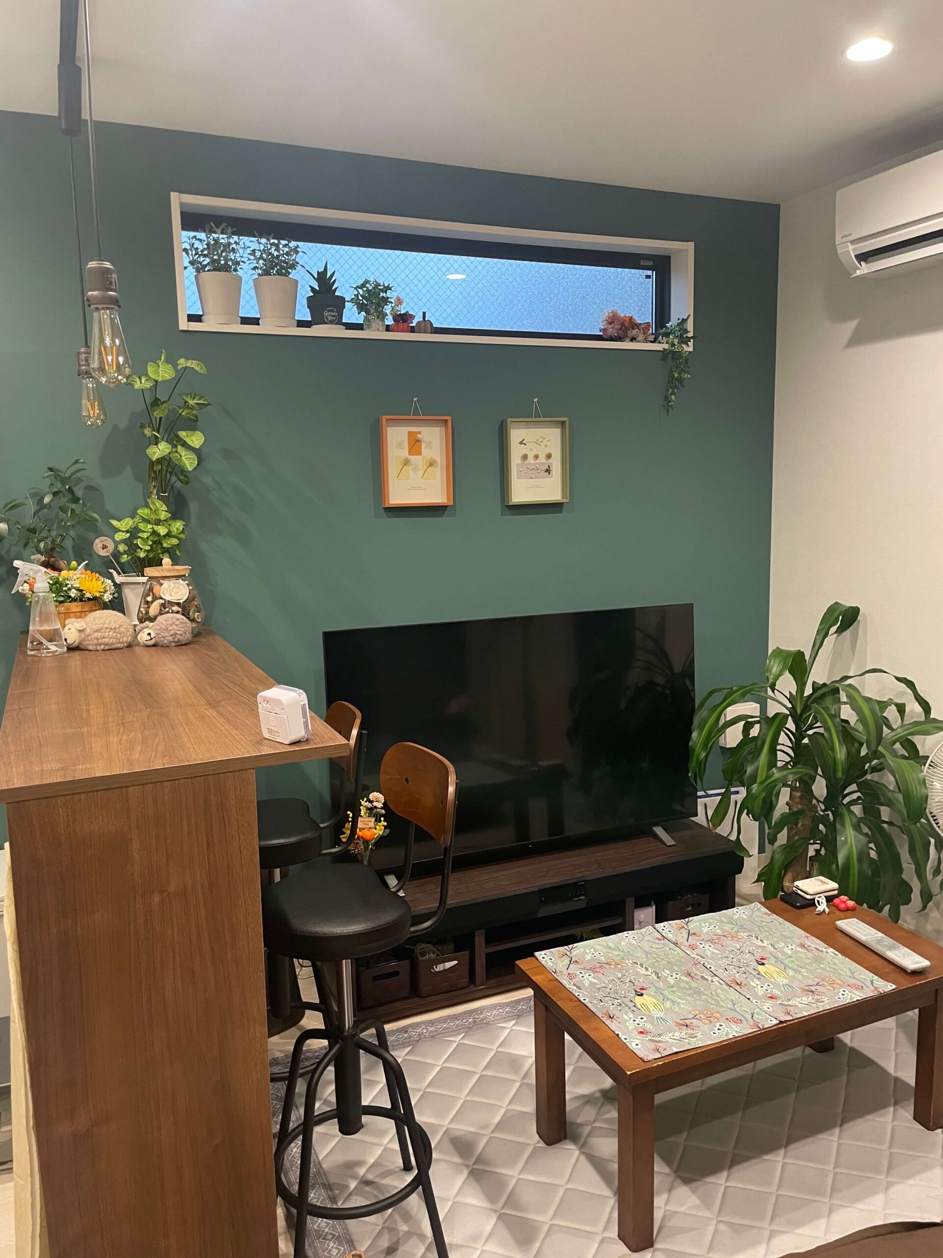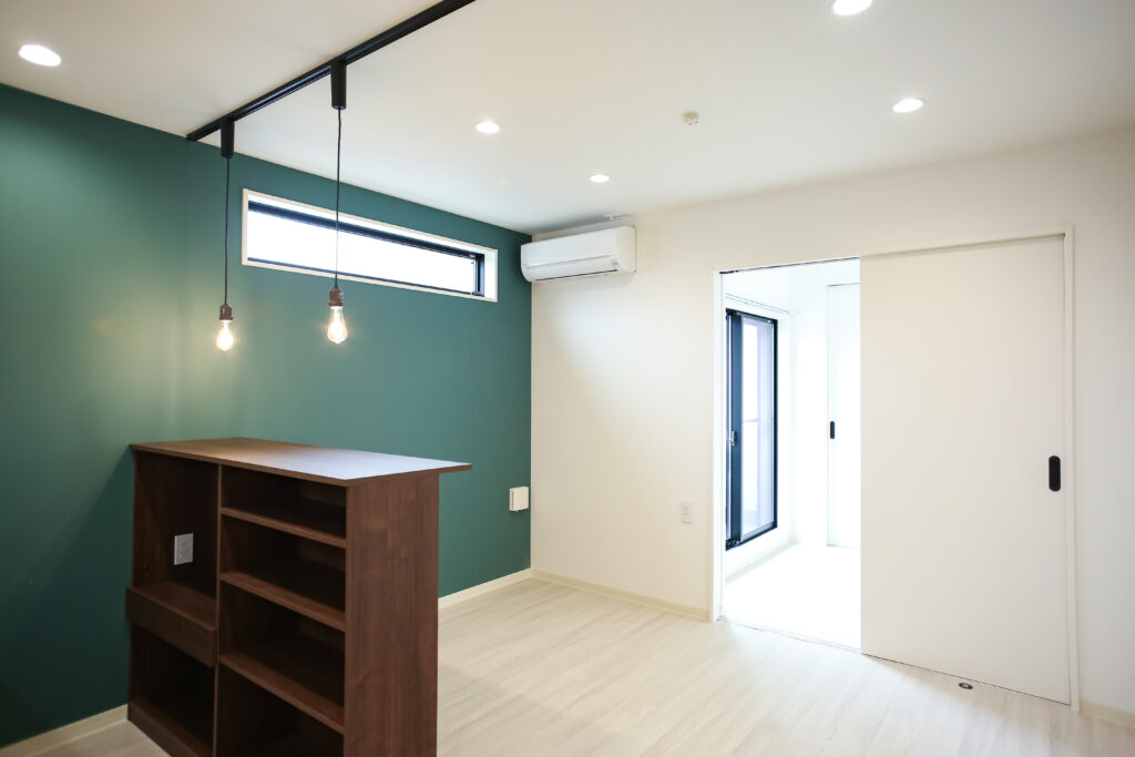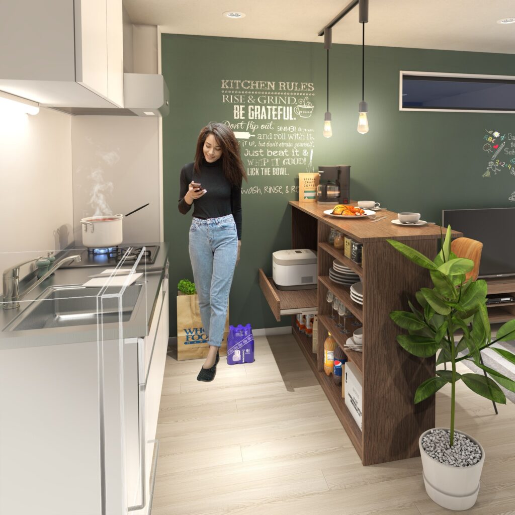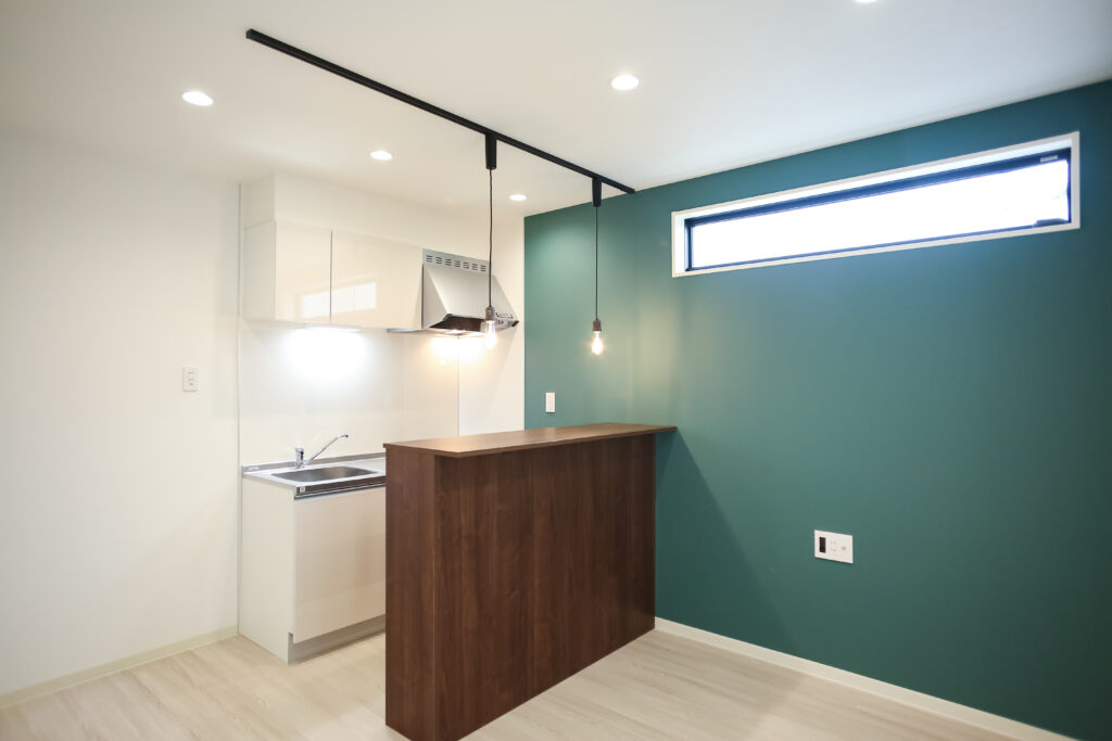 フィーカプランはそんな時間を楽しめるように、キッチンには奥行のある木目のカウンターを設置。ここでゆっくりコーヒーがドリップされていくのを眺めながら、ゆったり過ごせるようにペンダントライトの柔らかい照明やカウントの周りに黒板クロスを採用しています。