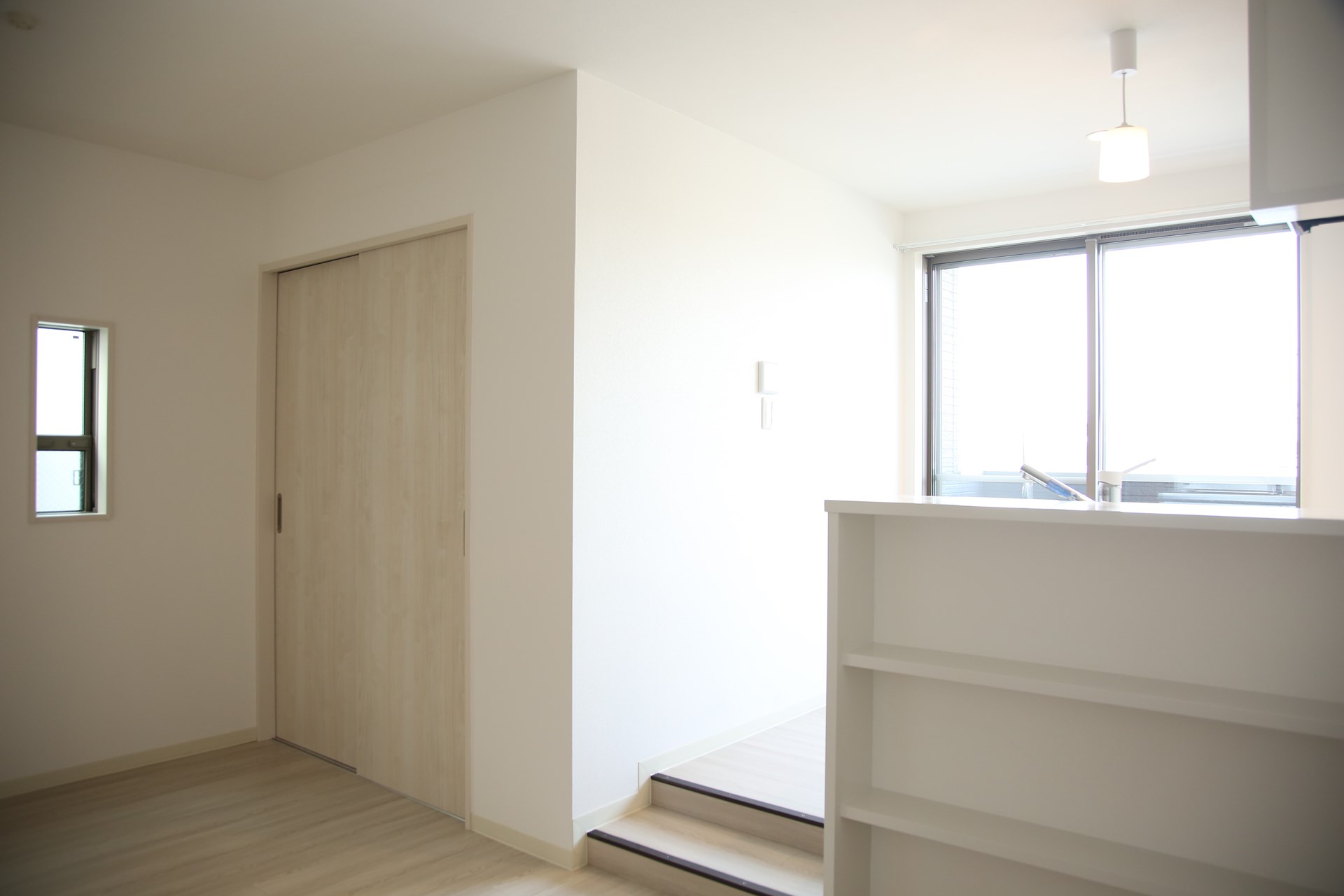 カウンターキッチンは少し床高を上げて、キッチンからリビングの様子を見渡せるようにすることで、同じ空間を感じられるようにしています。