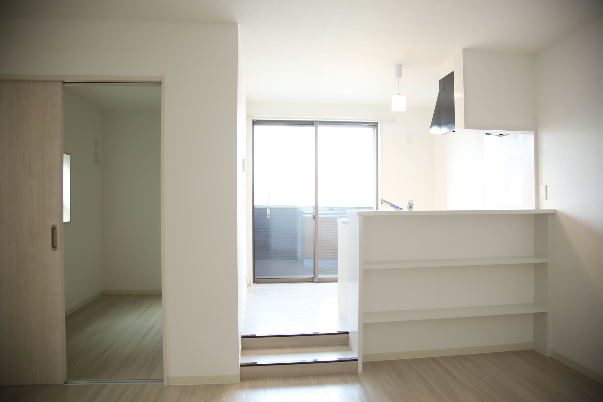 カウンターキッチンは少し床高を上げて