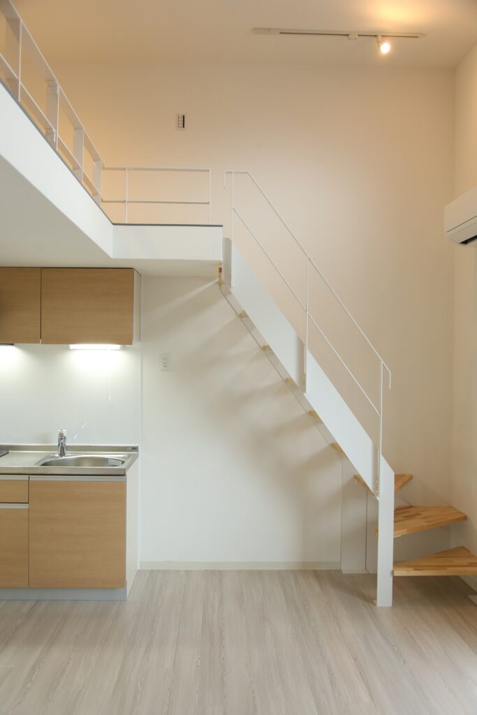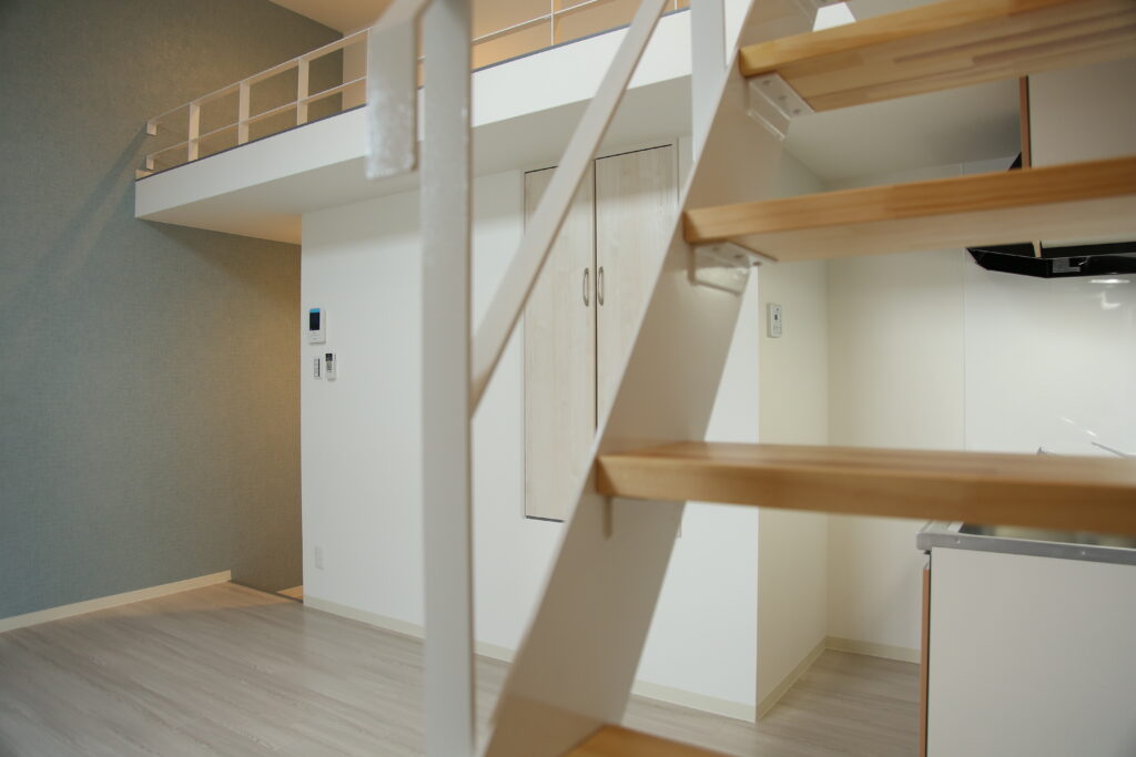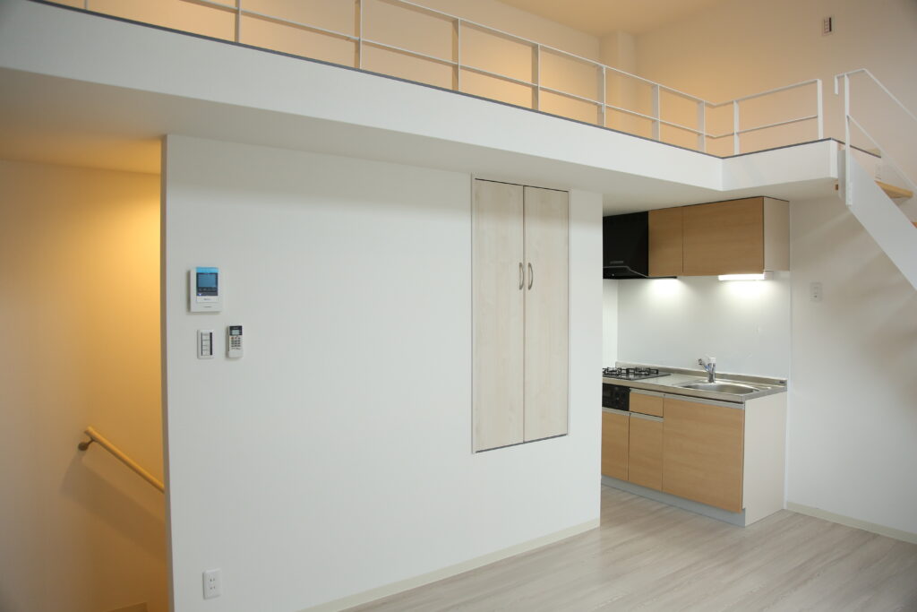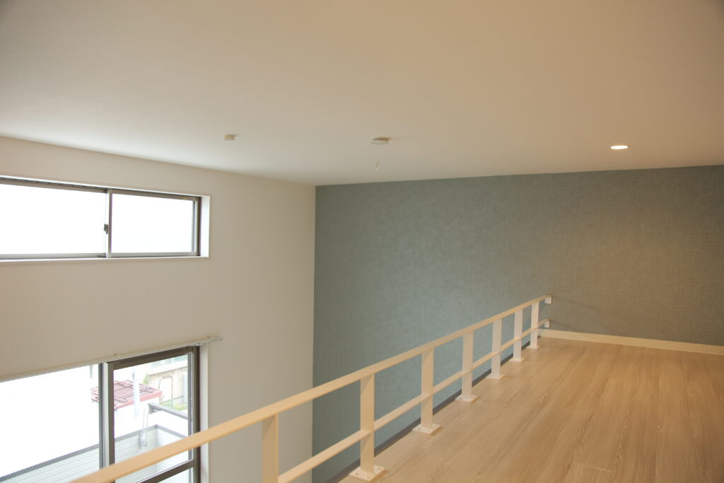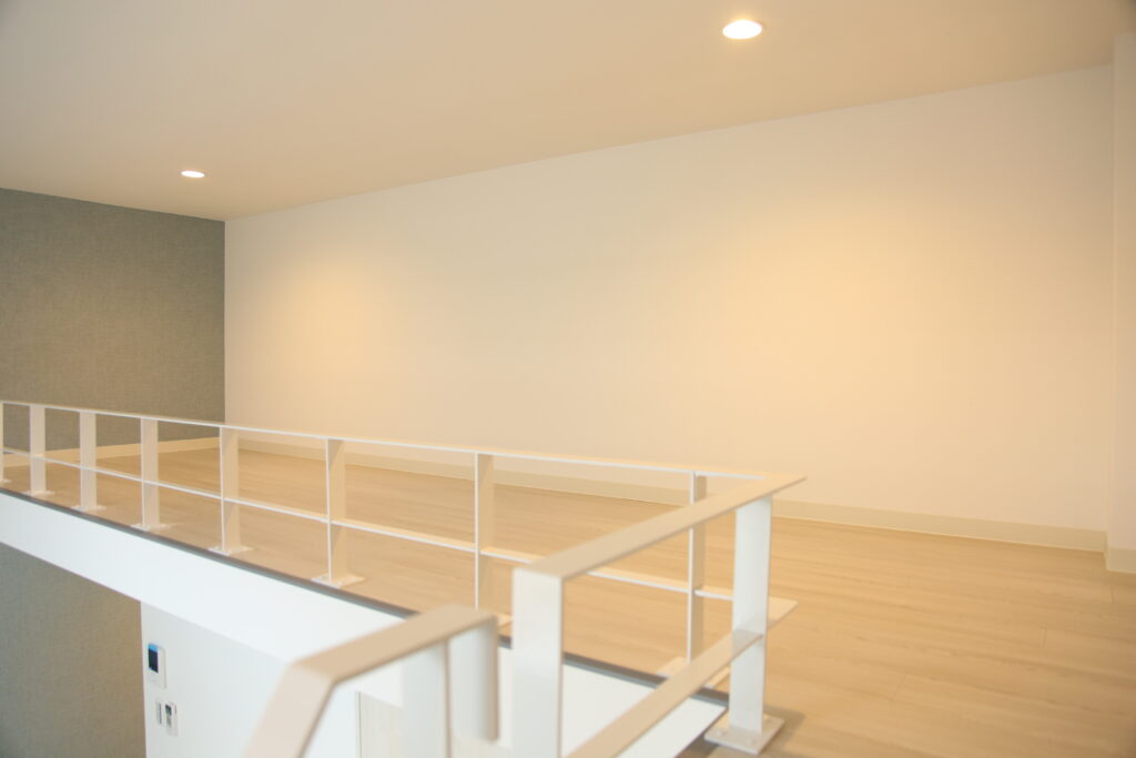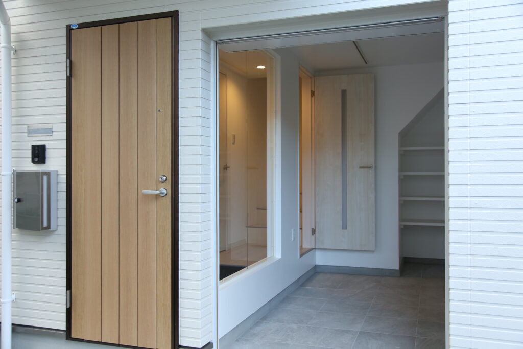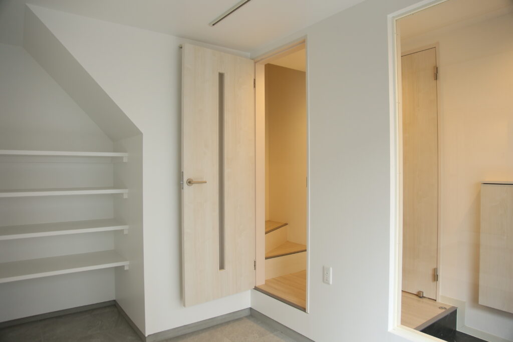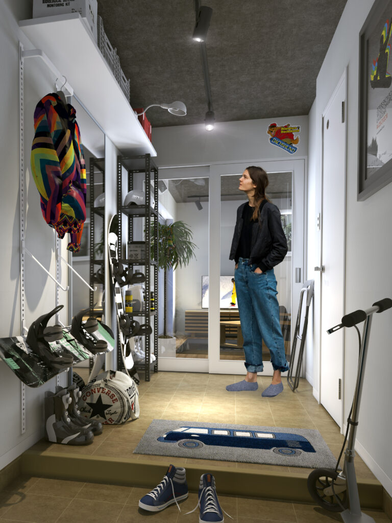 そこで、メゾネットタイプのギャラリープランは、玄関とは別にフリースペース直通の入口をつくり、玄関周りにそれらを置けるフリースペースを確保。