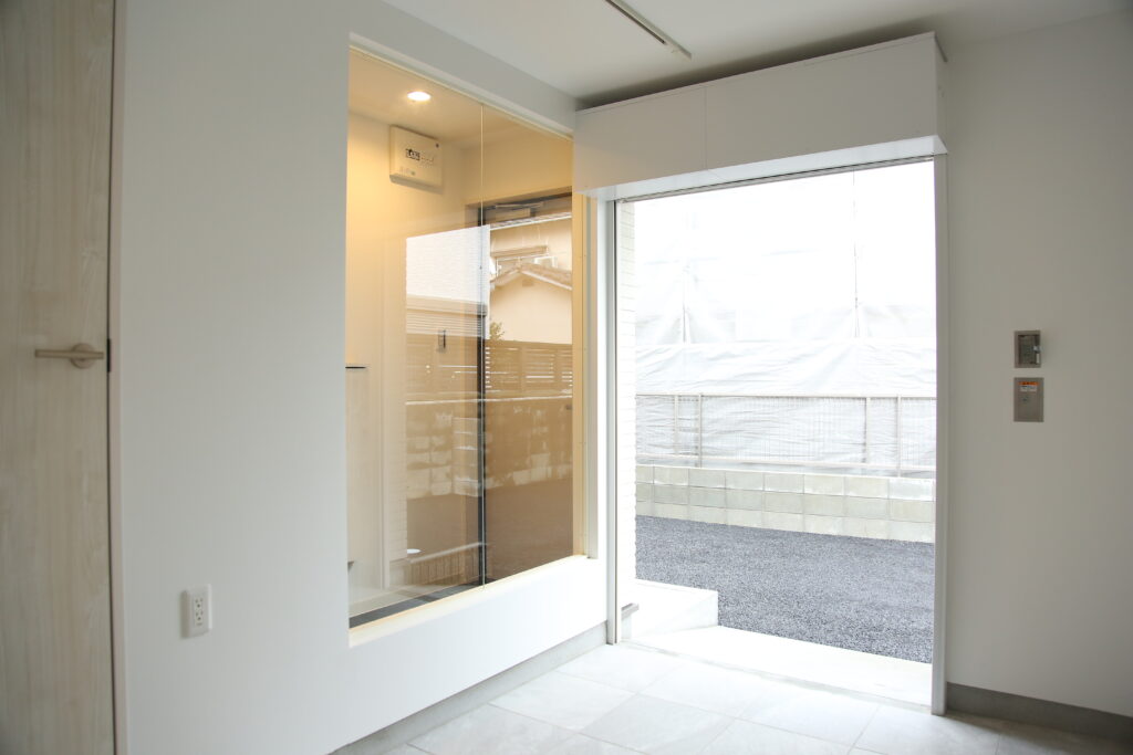 電動シャッターで開閉し、自転車やバイクの乗り入れも可能にしています。