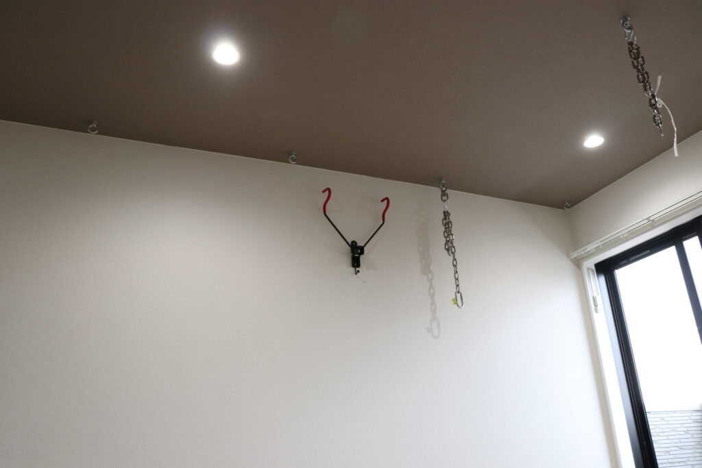 ヒュッゲプランのお部屋は、入ってまず目を引くのは、天井から吊られたハンモック。床は、木目を際立たせるエイジング加工をした天然ナラを使用しているため、素足で歩くと気持ちが良いです。リビングの壁のフックにはロードバイクをかけられます。