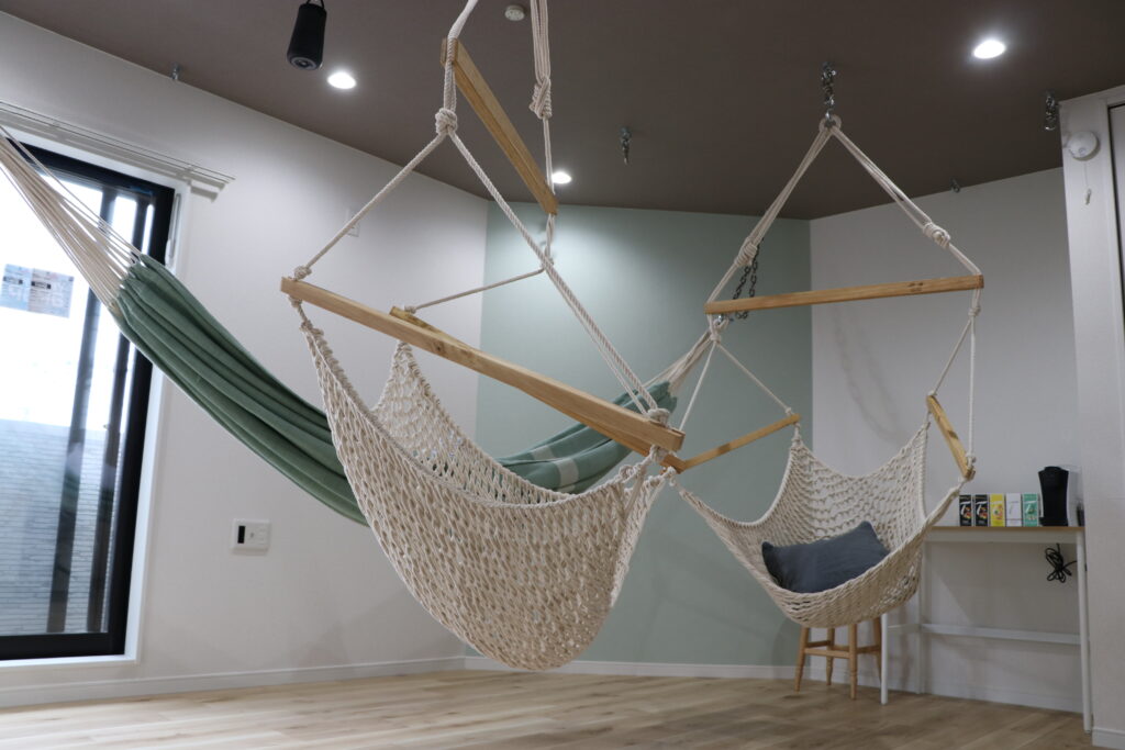 都会の喧騒の中でここだけゆったり時間が流れるような、のびのびとした雰囲気と曲線にデザインされたフロアとハンモックが居心地の良い空間を作り出します。