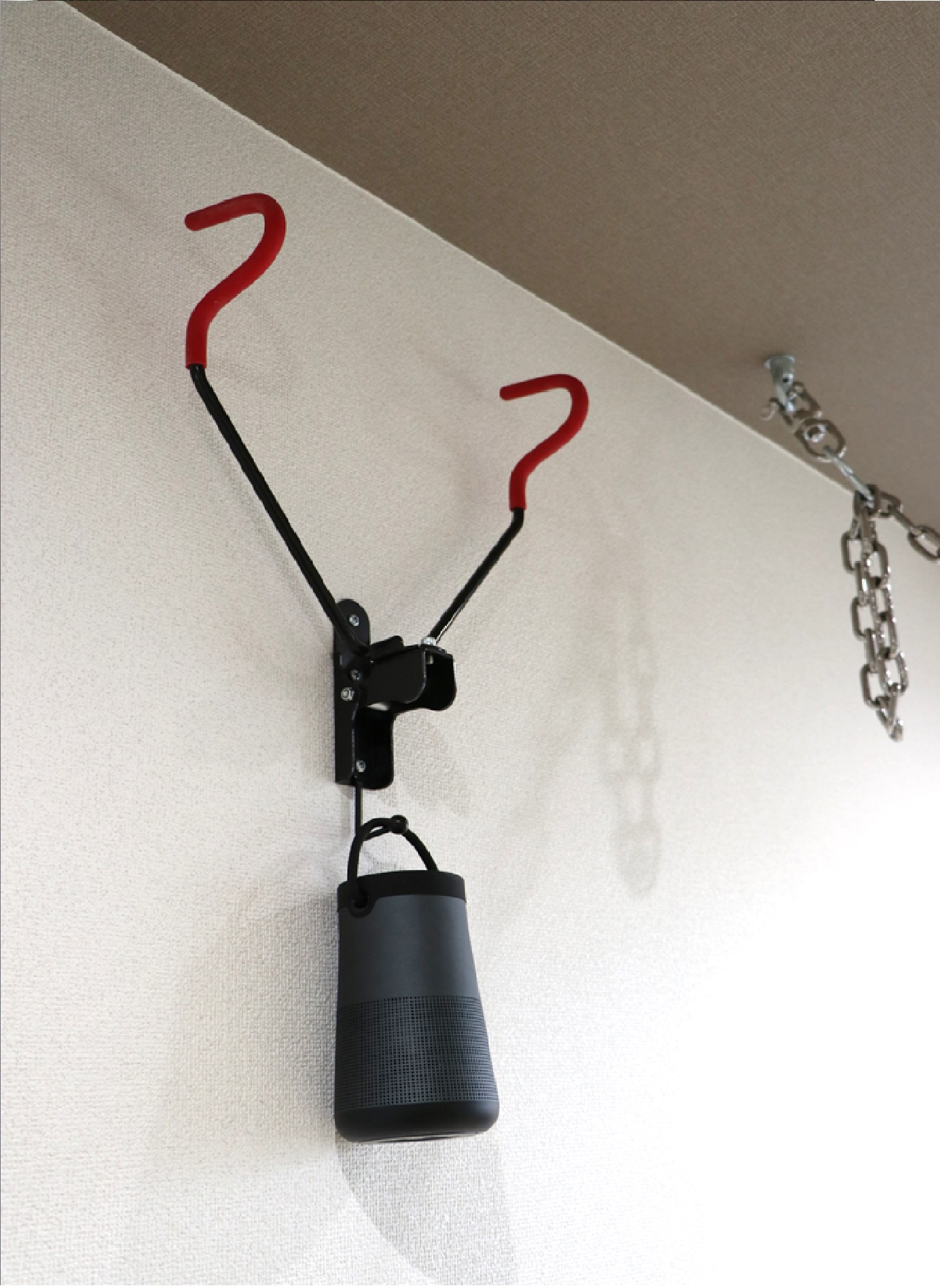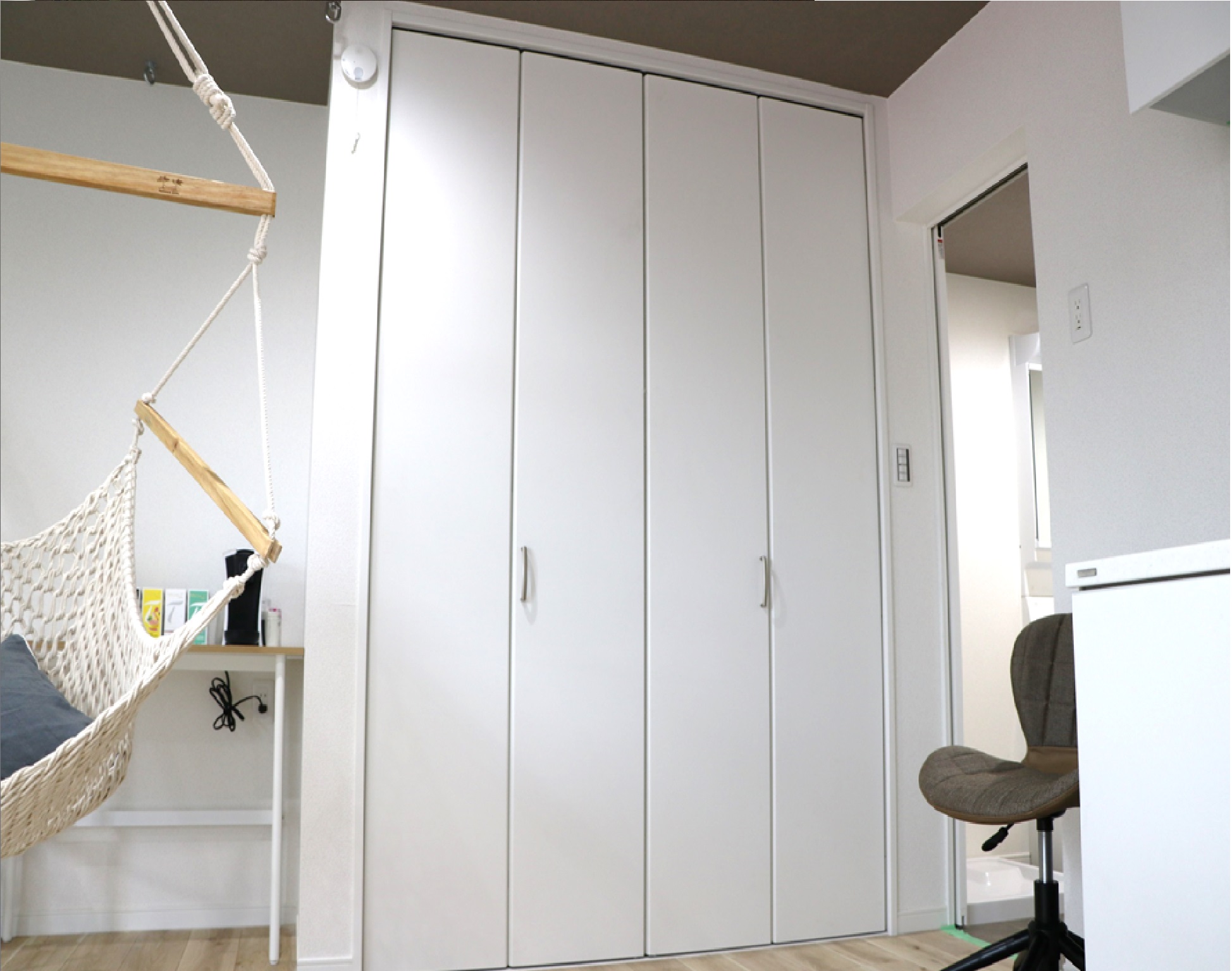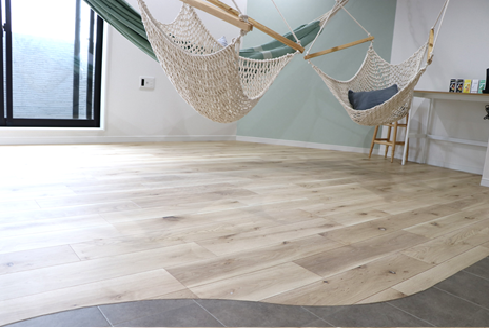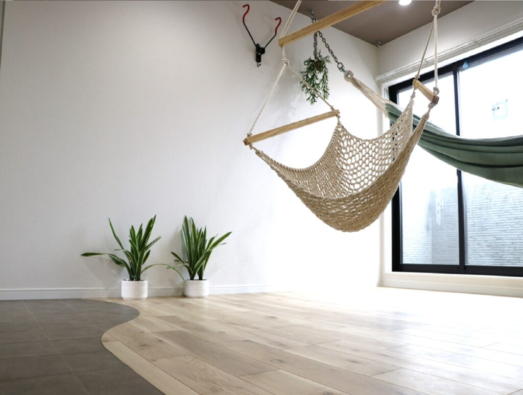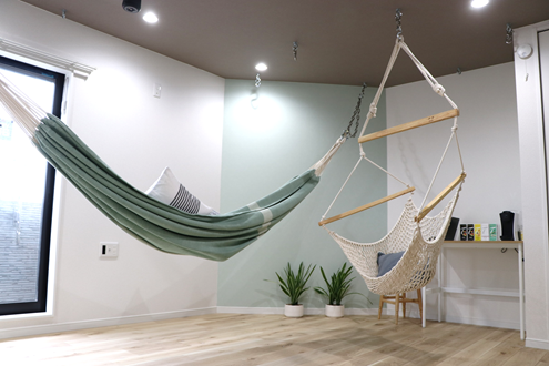ヒュッゲプランのお部屋は、入ってまず目を引くのは、天井から吊られたハンモック。床は、木目を際立たせるエイジング加工をした天然ナラを使用しているため、素足で歩くと気持ちが良いです。リビングの壁のフックにはロードバイクをかけられます。