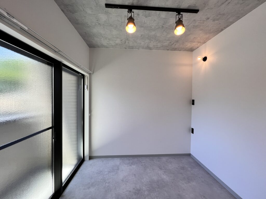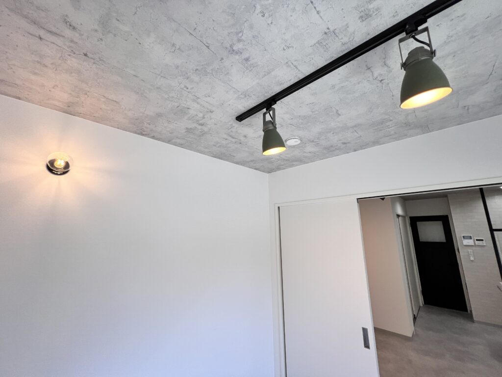 コンクリート調のクロスや床材をベースにモノトーンで色調を統一。細部にはアイアン製の素材感あるアイテムを使っているため、無骨なインテリアが映えるお部屋になっています。
