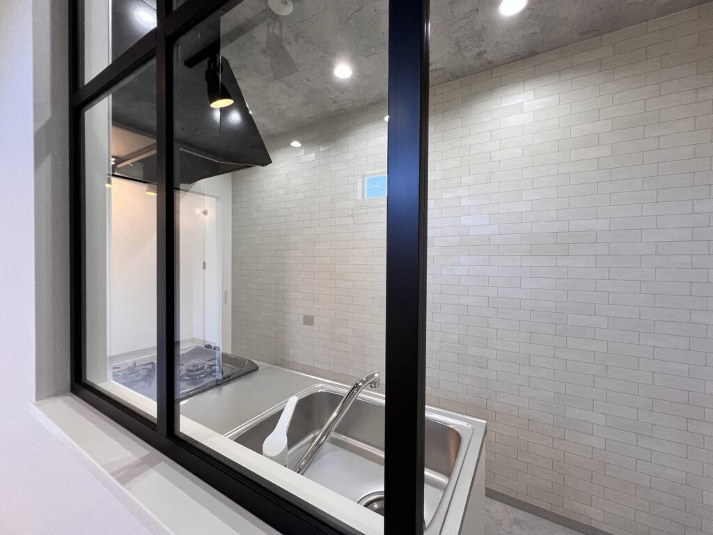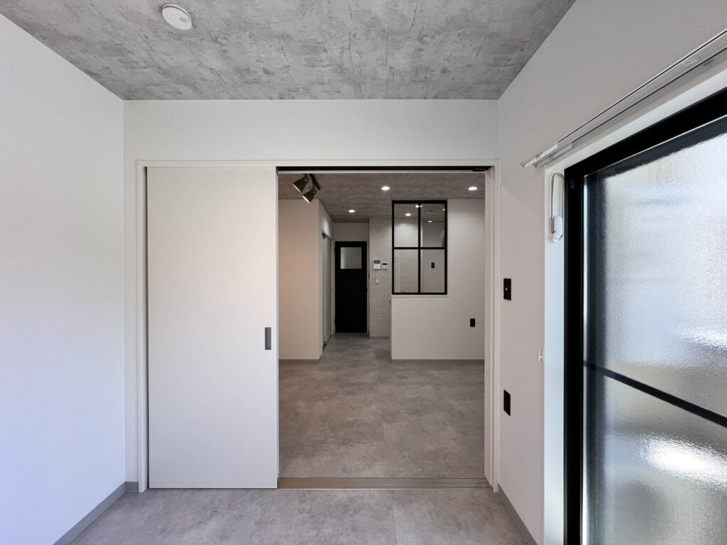 部屋の間仕切りには、格子のウィンドウを使用。圧迫感がなくなり、実際の面積以上に広く感じられます。