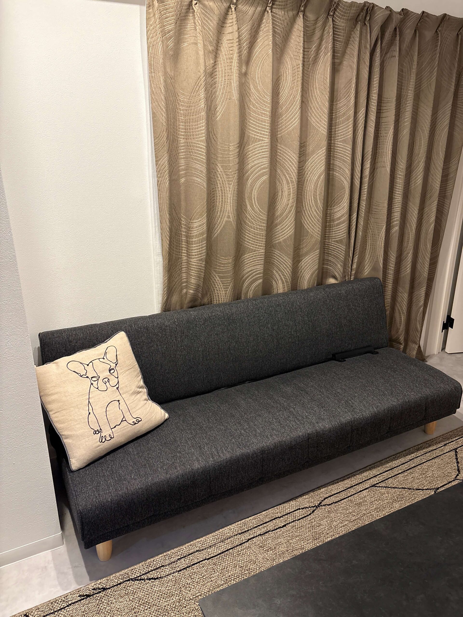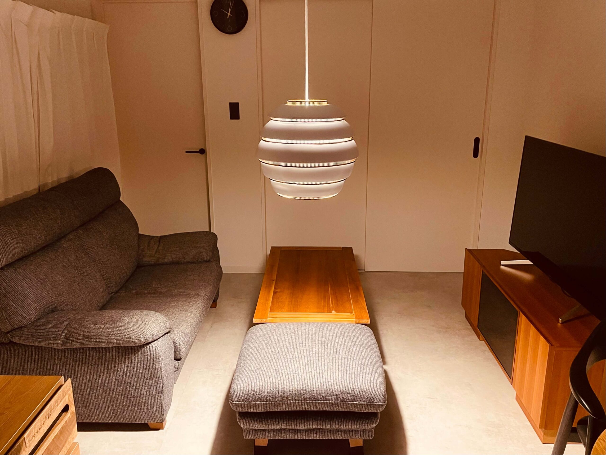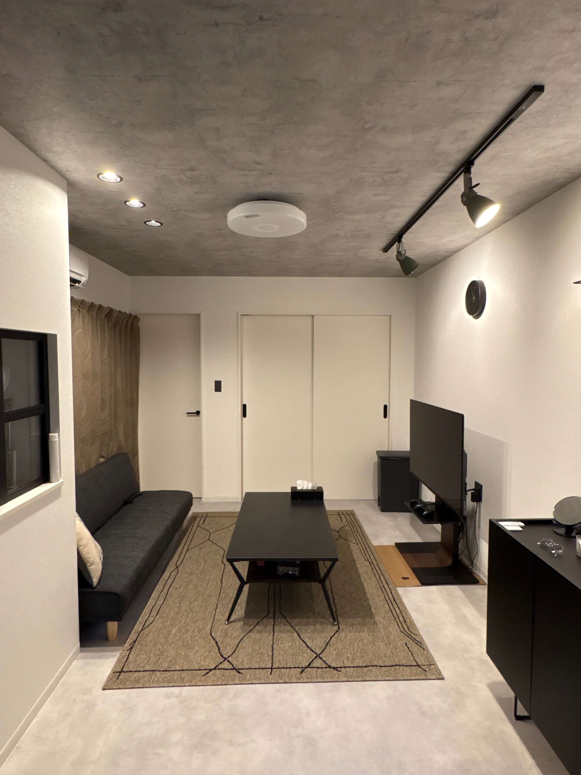 コンクリート調のクロスや床材をベースにモノトーンで色調を統一。細部にはアイアン製の素材感あるアイテムを使っているため、無骨なインテリアが映えるお部屋になっています。