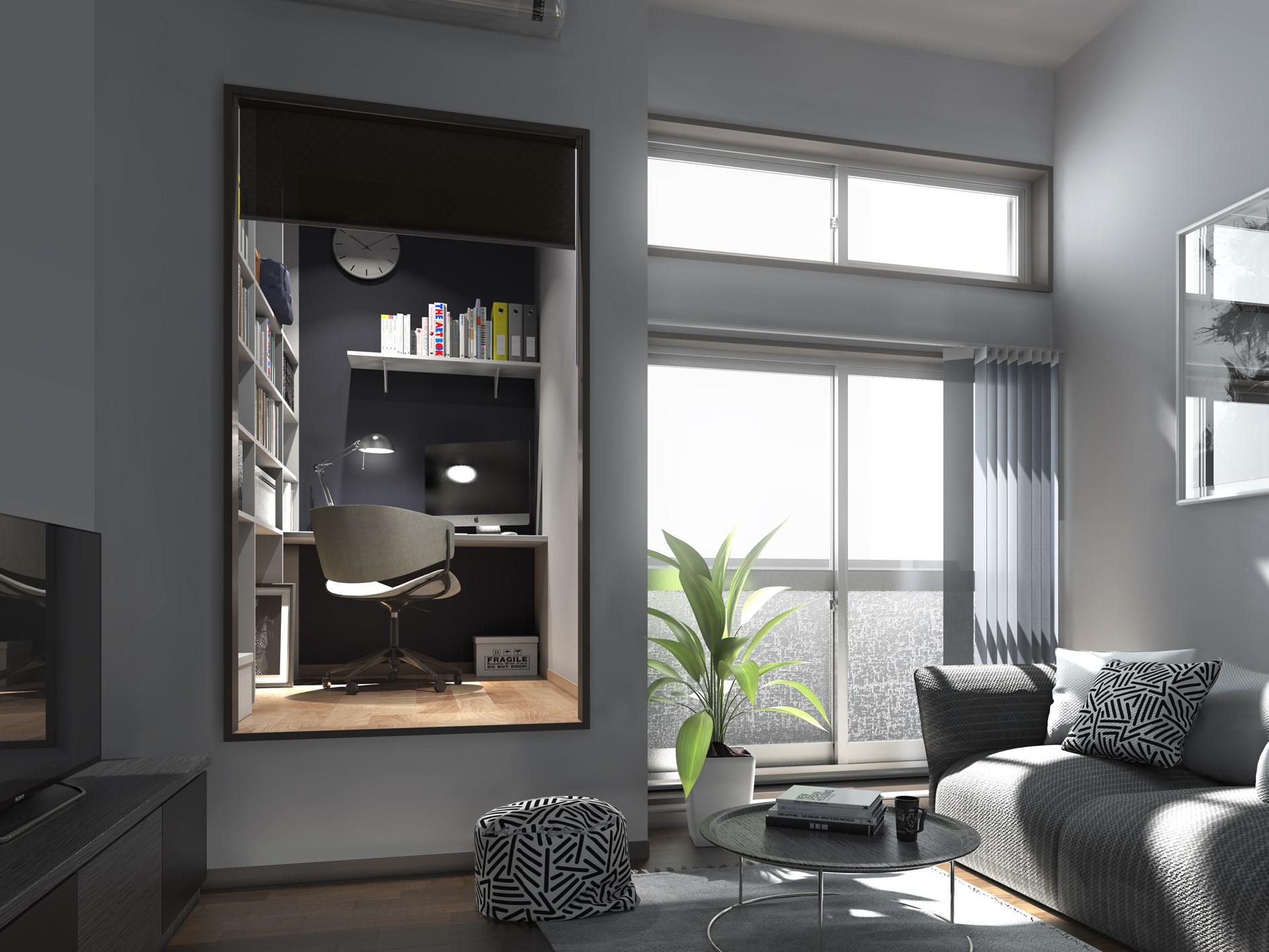 隠れ家の中は集中力を高める、グレーブルーを基調にしたデザイン