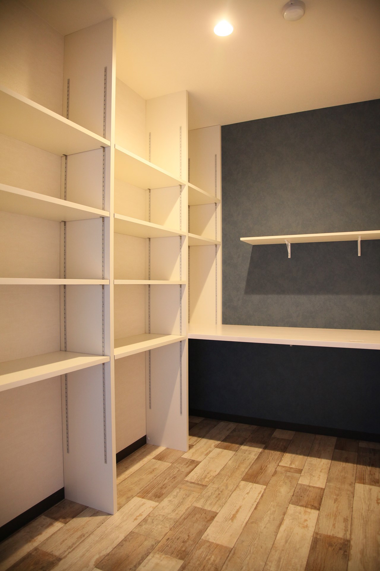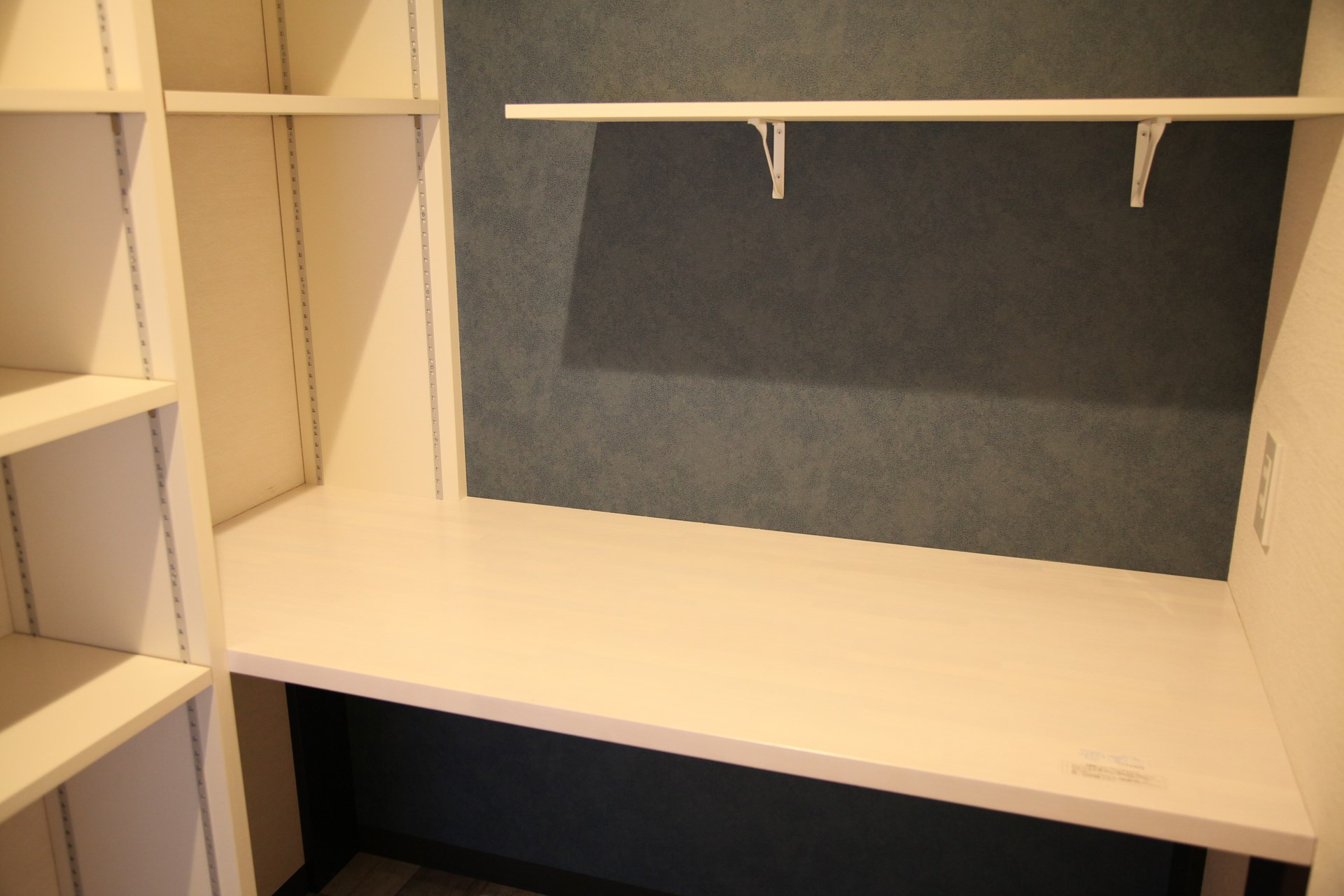 隠れ家の中は集中力を高める、グレーブルーを基調にしたデザインで、オトナの書斎というイメージ。