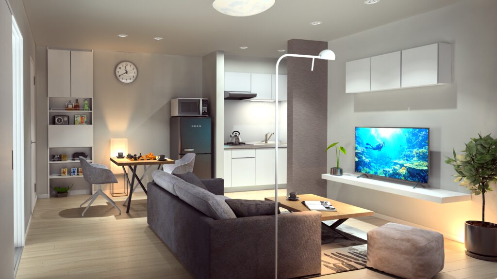 備え付けのTVボードは床から浮かせた壁付けタイプ。掃除もしやすく「キレイ」を保てます。また、壁の上部には扉付きの棚があり、収納棚で部屋を圧迫することなく広々と使えます。